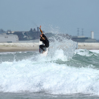爽やかな秋晴れ!ゆるいオンショアが吹く腰〜胸ファンウェーブでの深沼セッションの様子です。